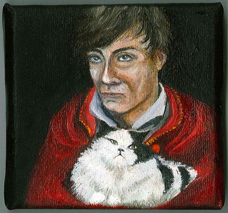 After a spate of break-ins in her London home, Otto’s owner feared for her cat’s safety. My friend Jamie stepped in like a gallant knight to the rescue and offered to keep the cat safe here in Norwich (perhaps with the secret hope of winning the owner’s heart in the process). Over six months, playing with string and putting up with furry pillows, Jamie won Otto’s heart, and in turn Otto won his. This painting commemorates their bond in the days before Otto was returned to his original owner.